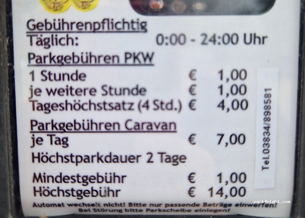 Parking Eldena, daily ticket without overnight stay quietly at the edge of the water. Restaurant 2 minutes walk. Without electricity and without disposition. Overnight up to 8 hours free
