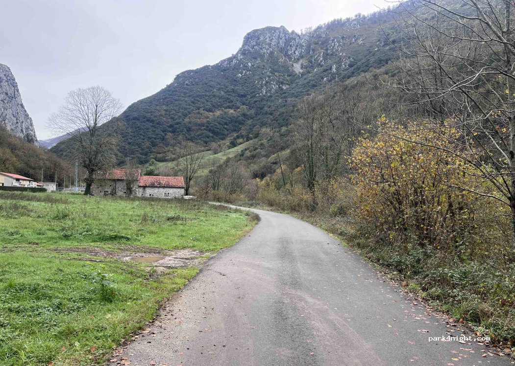 Rastplatz ohne Parkplatz in Arenas de Cabrales. Die Zufahrt erfolgt von der Hauptstraße, vorbei an den Supermärkten, dann links abbiegen auf eine ca. 200 m lange, bergauf führende Straße. Nach der Käserei auf der linken Seite folgen Sie einer schmalen, asphaltierten Straße mit einer Brücke, die ca. 1 km lang ist.