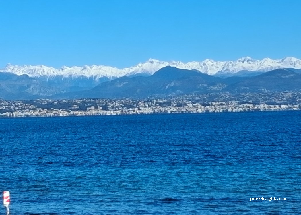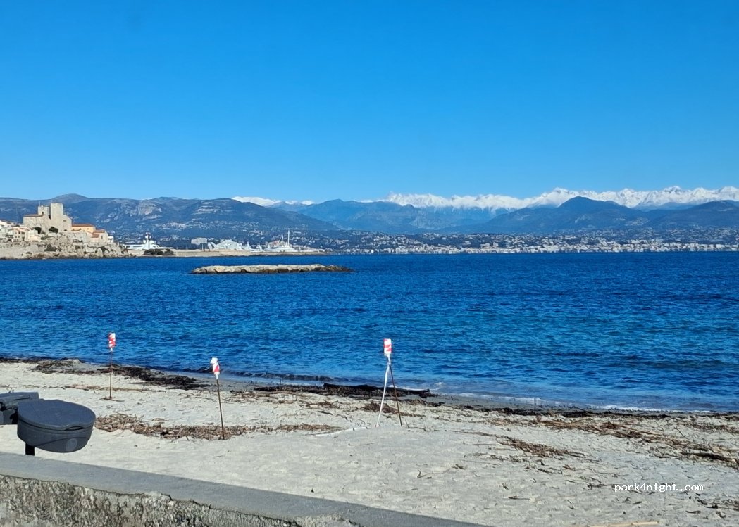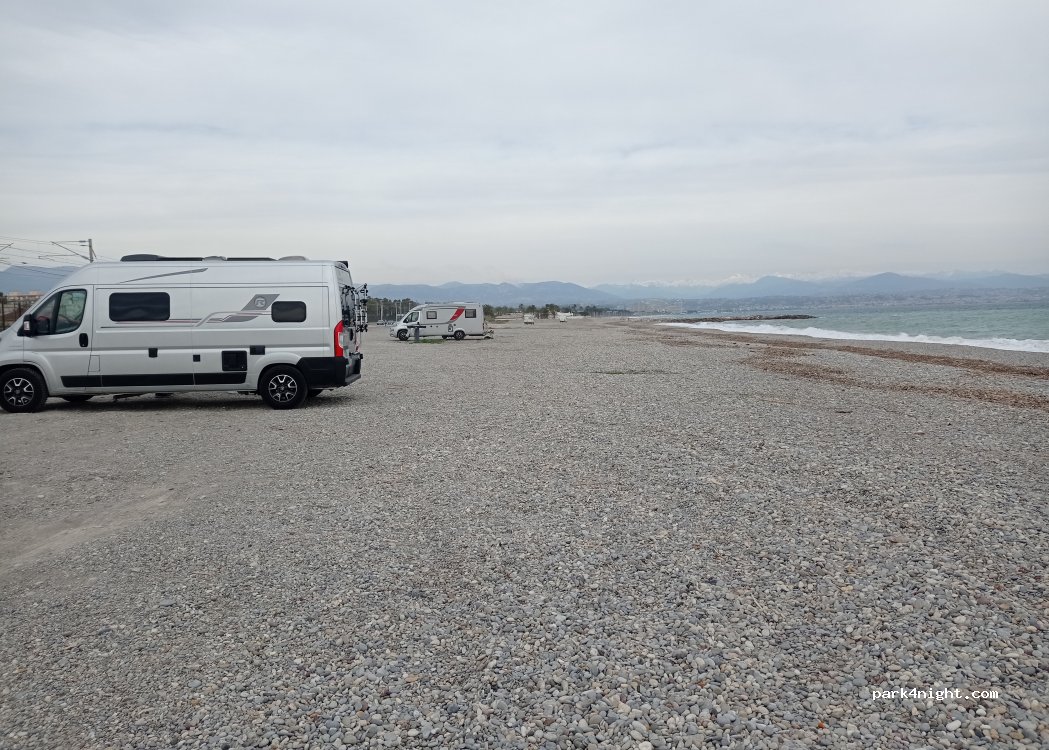 Sehr breiter Strand. Außerhalb der Saison (Oktober bis April) ist die Zufahrt für Fahrzeuge mit Insassen über 1,90 m Körpergröße und 5 m Länge nicht gestattet. Nachts ist die Straße, die am Campingplatz entlangführt, kaum befahren; es ist sehr ruhig. Für Wohnmobile und Vans: Nur eine Nacht, dann weiterreisen. Tagsüber patrouilliert die Polizei. Wunderschöner Blick auf die Alpen und den Yachthafen Baie des Anges. Direkter Zugang zum Strand und Meer.