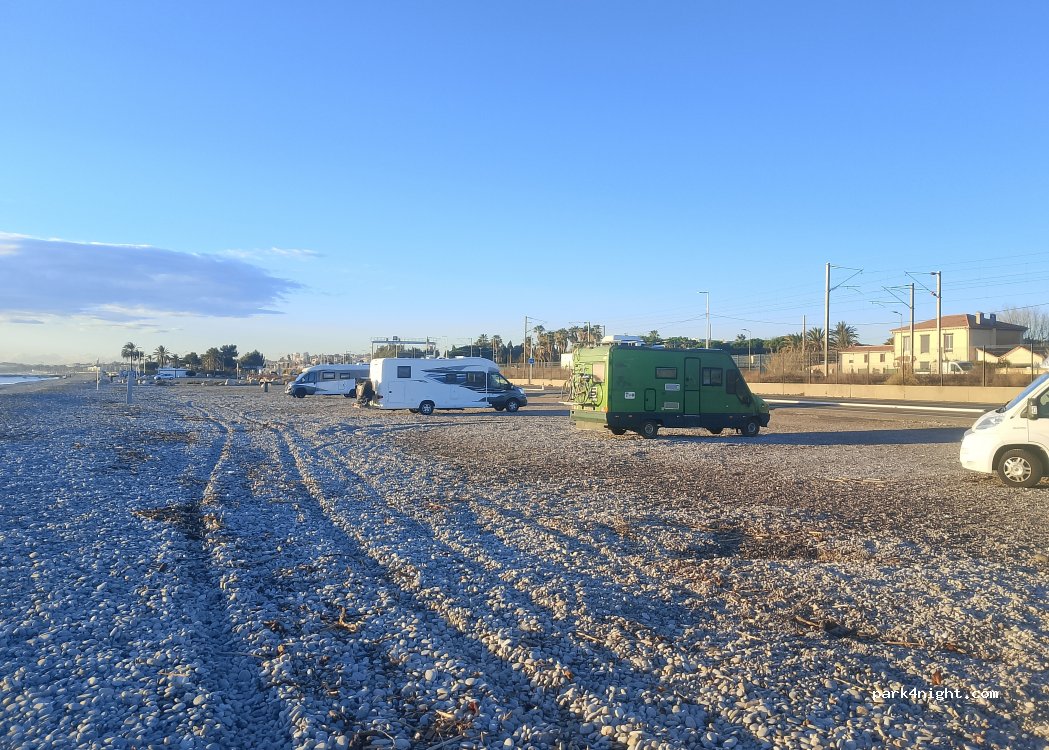 Very wide beach. Off-season tolerance (October to April). Otherwise, a sign prohibits vehicles with occupants over 1.90m high and 5m long. Few cars on the road at night that runs alongside the site; it's quite quiet. For motorhomes or vans: one night, then leave. During the day, I believe the police patrol. Beautiful view of the Alps and the Baie des Anges marina. Direct beach and sea access..