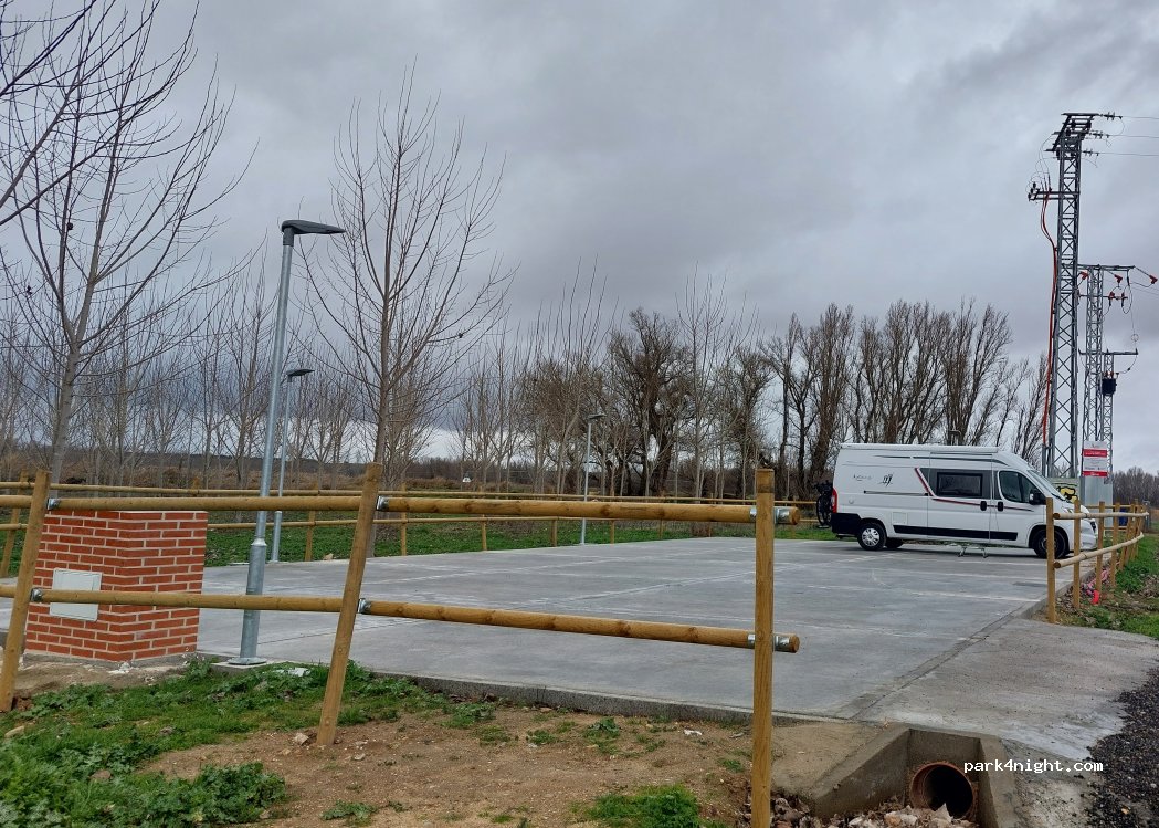 Free motorhome area, brand new. Next to a field and a sports hall. Close to the town's bullring. Thanks to the mayor of this town for creating a free area. Other towns could learn from this and have areas for us.