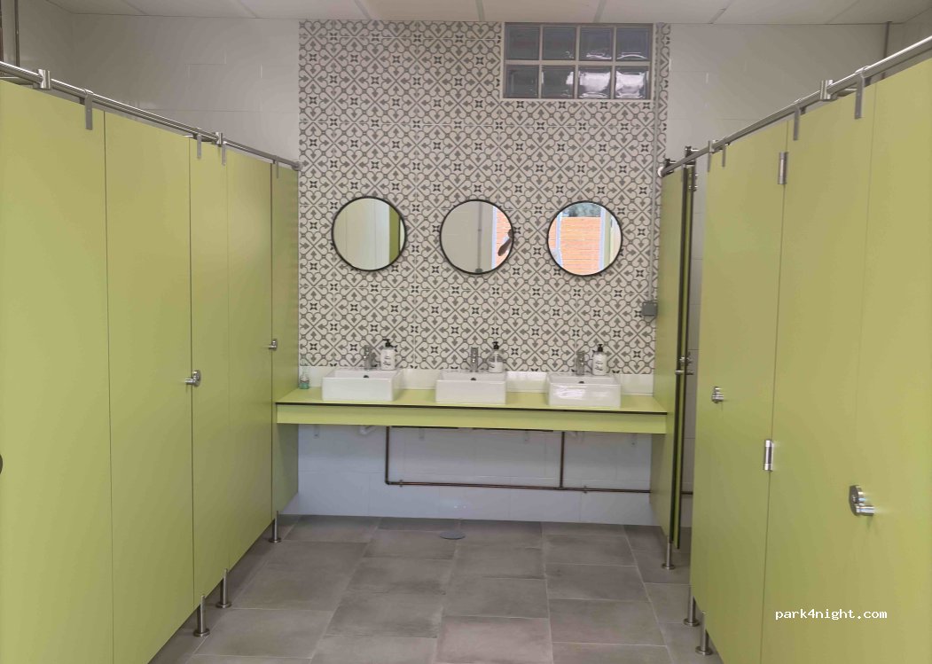 Our facilities are new and still under construction. However, you can already use our separate men's and women's restrooms, each with 4 showers, 4 toilets, and 3 sinks, as well as a large accessible toilet for people with reduced mobility. We are also working on additional projects, such as a shop/bar, a swimming pool, and more parking spaces.
