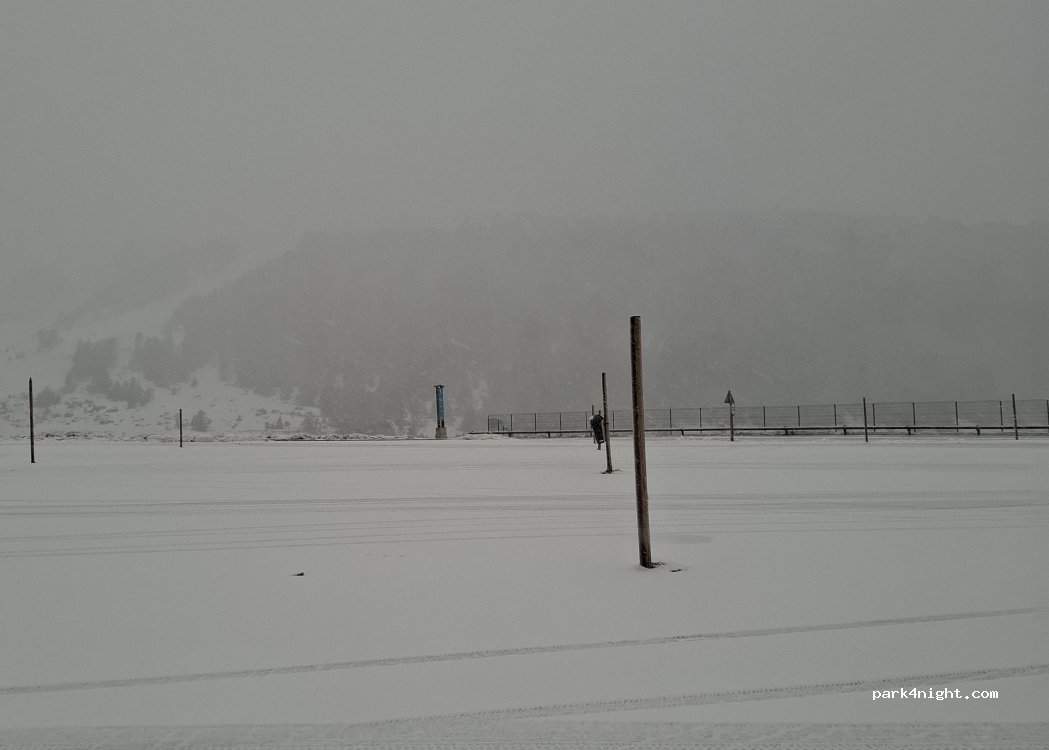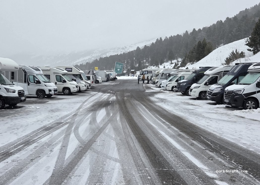 aparcamiento de la estacion de esqui de Grau Roig, teoricamente 25 plazas, pero he llegado a ver mas de 60. No he visto aun nunca denuncias de la policia, los trabajadores dicen que no se puede aparcar pero por ahora "toleran" Yo he subido con caravana, pillando nevada bestia de +40cm, OJO si subis sin neumaticos de invierno o cadenas. Frio muy intenso, asi que vigilar liquidos y calefaccion!