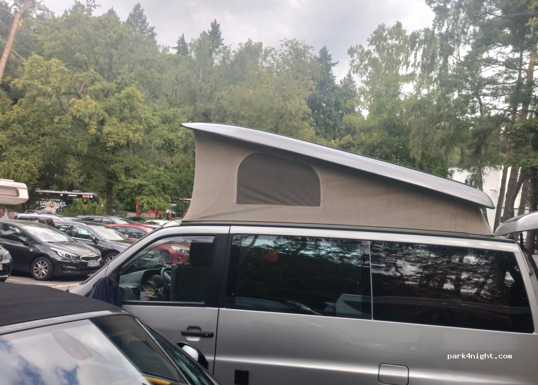 Large parking lot with enough space in the forest, quietly located at the cemetery. Quiet at night, but traffic on the busy street in the direction of the city center starts at 5 a.m. During the day the toilet in the cemetery building is open.