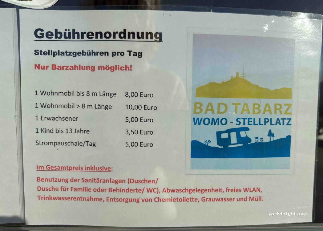 The new parking space for the mobile home was only opened at Pentecost 2020! Now there are also toilets and showers, power connections, supply and disposal as well as WLAN. Close to the Magnificent spa and family swimming pool in Bad Tabarz, bakeries, shops and restaurants. In addition, the entrance to the "Großer Inselsberg" observation tower with its 3 exhibitions (winter sports, Geopark Inselsberg-DreiGleichen and Thuringian Forest Nature Park) is included with the spa card. Public transport (bus and Thuringian Forest Railway) can also be used free of charge with the spa card.