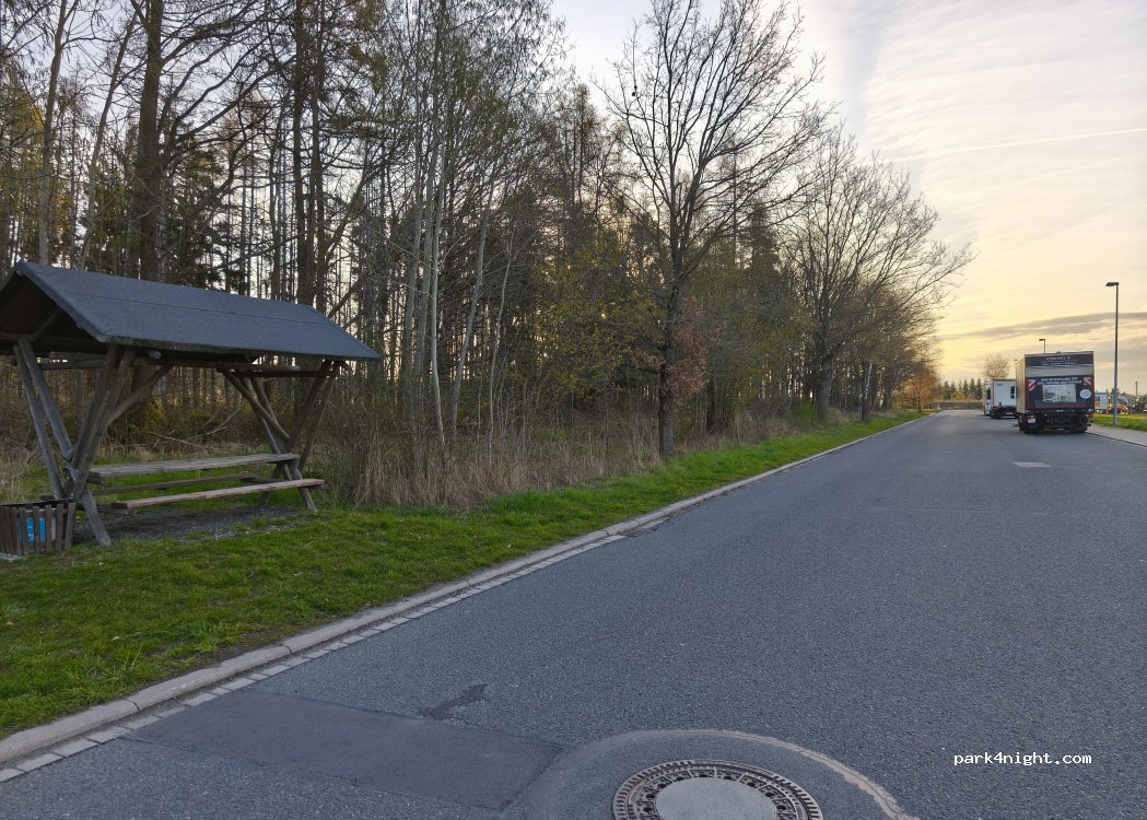 A solo dos minutos de la autopista, se encuentra esta área de descanso nocturno de emergencia. Se puede aparcar (al menos los fines de semana y festivos) con poco ruido de camiones y en completa tranquilidad. Hay una pequeña zona boscosa y una pradera. Próximamente se construirá una residencia canina. Hay una tienda agrícola cerca.