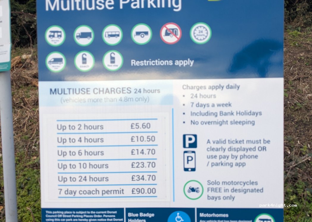 Very expensive and a fair walk down to the Cobb . Parking is now increased to £22.50 for 10 hours for over 6m vans (see photos)