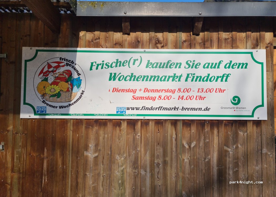 Wärend des "FREIMARKTES", dem "BREMER OKTOBERFEST" (800 m nah) ist am Finndorfer Markt Parkplatzmangel bis 23 Uhr Abend Bei Ankunft Di 14:50 einige Doppelplätze am Orangerie-Bunkerplatz noch frei, 15:15 ALLES BELEGT! Für Womo Übernachtung nur Di, Do, Sa ab ca 14:30 möglich! Sonntag ganztägig (?) frei. Wir hatten eine ruhige Di Nacht (alleine). Der P nebenan hat Begrenzung; tags 2h, nachts frei.