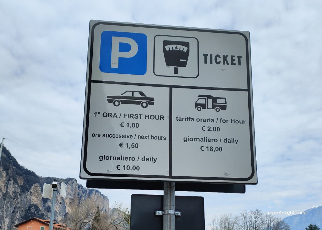 Kostenpflichtiger Parkplatz ohne Installationen, direkt umgeben von einer Industrieruine. Ausblick auf die Steilwand der Westküste des Gardasees grandios! 18€/Tag, zu zahlen mit Münzen oder NFC-Karte. gute Pizzeria gleich um die Ecke, kostenloser Wasserhahn Supermarkt 10 min zu Fuß/2 min mit dem Rad. Kiesstrand gleich um die Ecke.