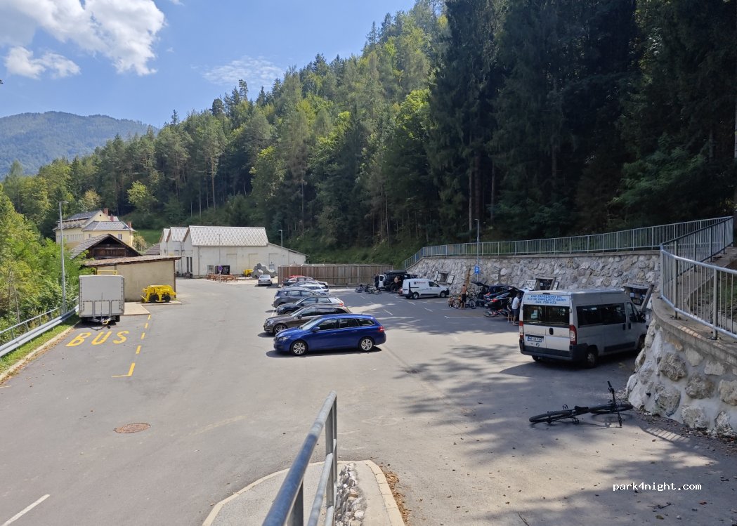 Parking Podzemlje Pece (Peca Underground), mine museum, mine tour by bicycle and kayak. Tables with benches and food/drink machines next to the parking.
