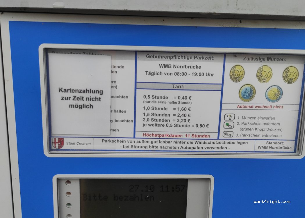 Goede plek om Cochem te bezoeken of om met een veilig gevoel een nachtje door te brengen. Betaalautomaat werkt alleen met muntjes. Stukje verder voorbij de bussen staat nog een parkeermeter en daar kan je met kaart betalen. 24 uurs dagkaart winterseizoen is 3 euro.