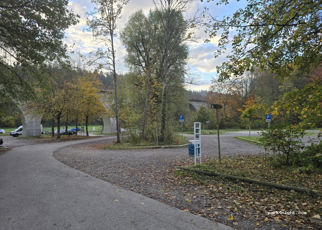 Parking de randonnée Eselsmühle. Grand parking derrière un ancien pont ferroviaire. Gravier souterrain, niveau. Un peu d'ombre. Grande prairie directement sur la place. Mauvaise réception de la radio mobile.