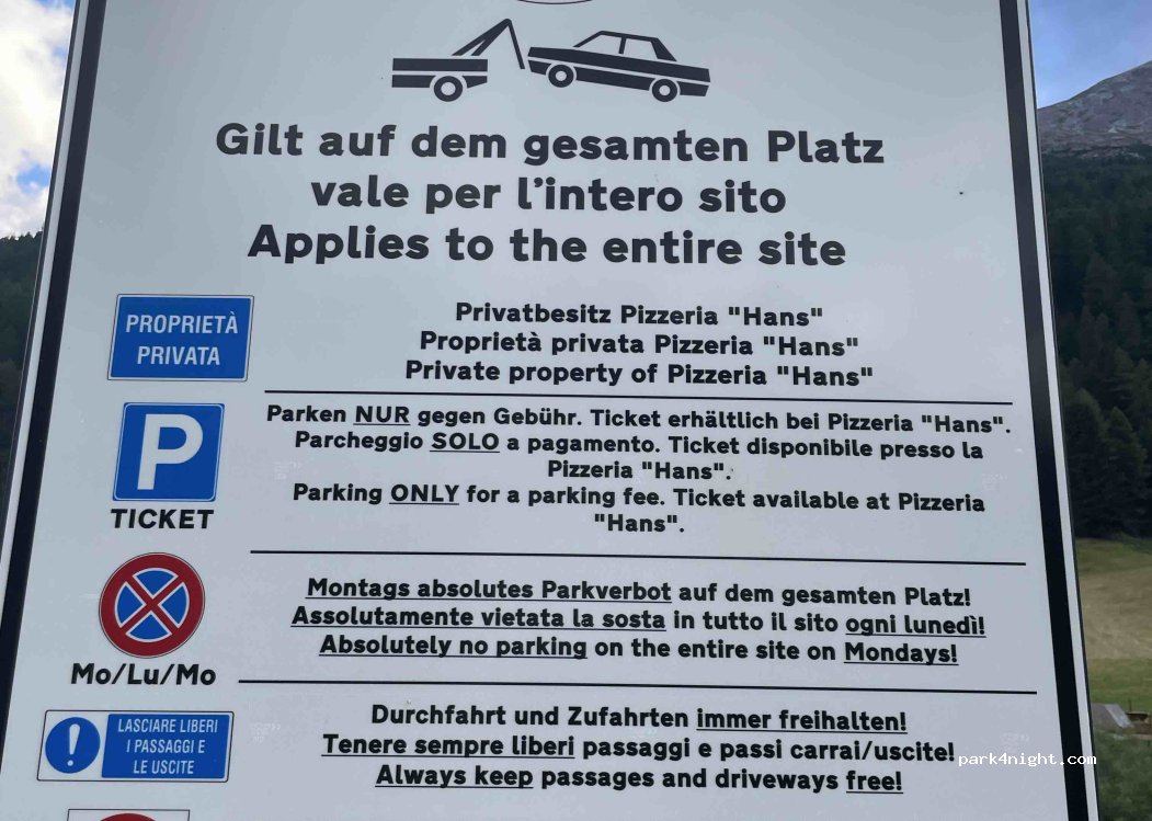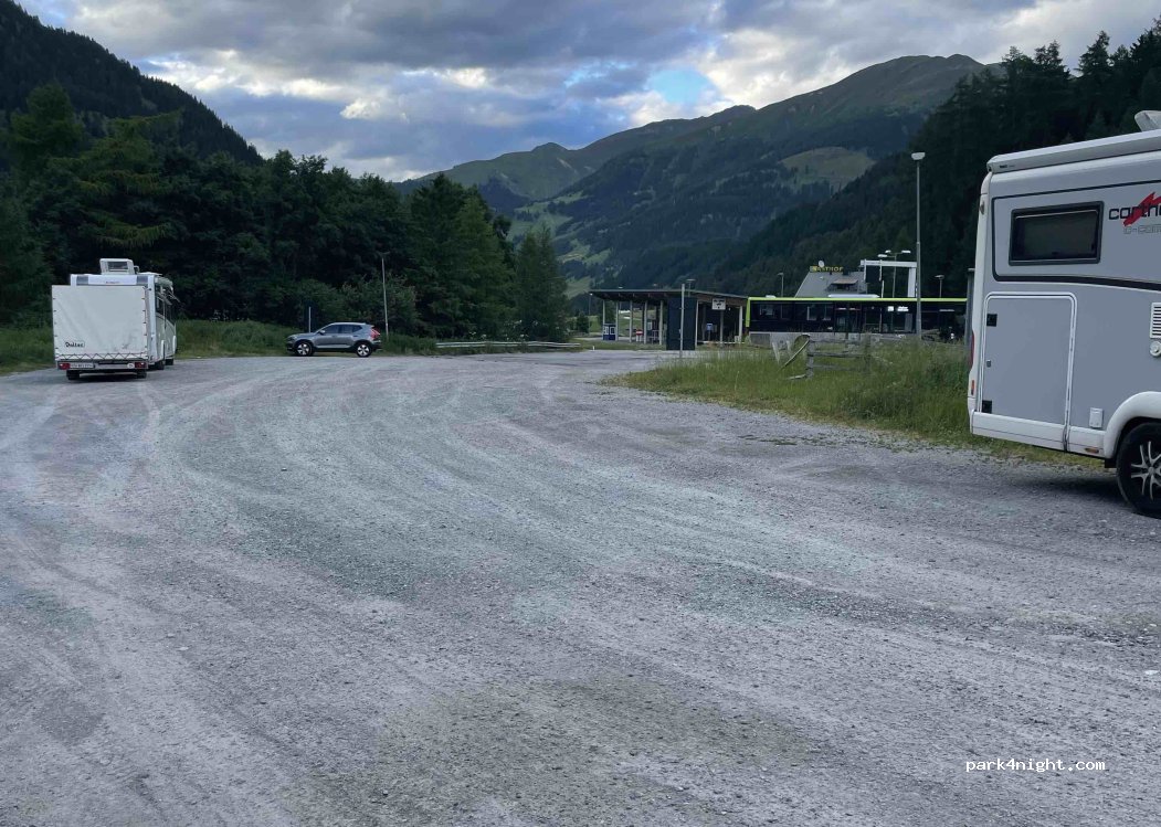parcheggio sul passo resia, gestito dalla pizzeria Hans. costo 10 euro a notte da pagare direttamente in pizzeria. ti danno uno scontrino da esporre sul finestrino. Ci sono diversi camper e van, posto tranquillo.