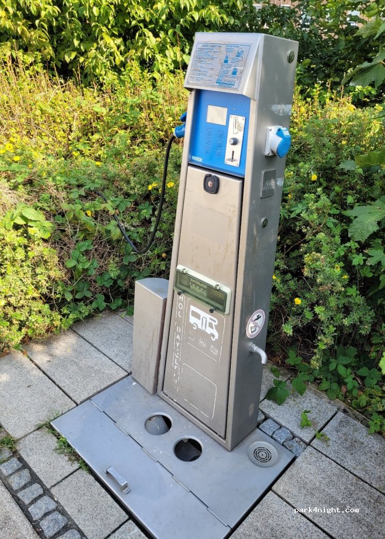 Wir haben hier nur die Ver- und Entsorgung genutzt. Es stehen 2 Plätze zur Verfügung. Beide Fahrzeuge hatten so weit außen geparkt dass wir die VE Station problemlos nutzen konnten. Grauwasser kommt in einen der beiden Bodenabläufe. Schwarzwasser mit Spülung am Automaten möglich. Trinkwasser konnten wir auch auftanken. 50 Cent = 1,40 Minuten = ca. 50-60 Liter.