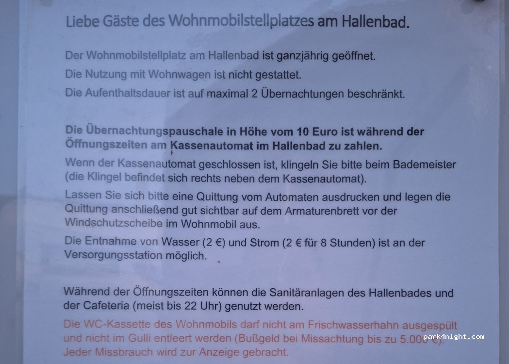 Netter Stellplatz mit Wasser und Strom direkt am Hallenbad. Mit dem Hund ist man gleich in Feld, Wald und Wiese. Wichtiger Hinweis: Parkticket am Automaten nur mit Bargeld (keine 50Euro Scheine). Netter Schwimmmeister und Badegäste, die helfen, wenn man nicht weiter kommt.