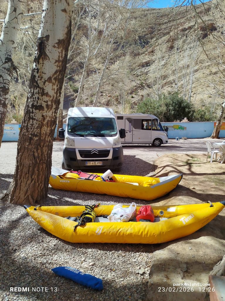 03/03/2023. Petit camping auberge dans les gorges du Dadès, au pied des grandes falaises. Accessible tous gabarits. Vidange cassette possible mais même robinet pour remplissage eau propre : dommage ! Pas de vidange eaux grises, sanitaires très moyens.