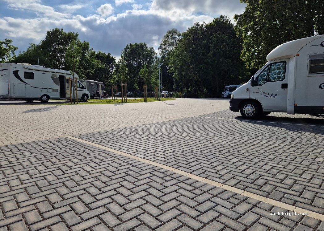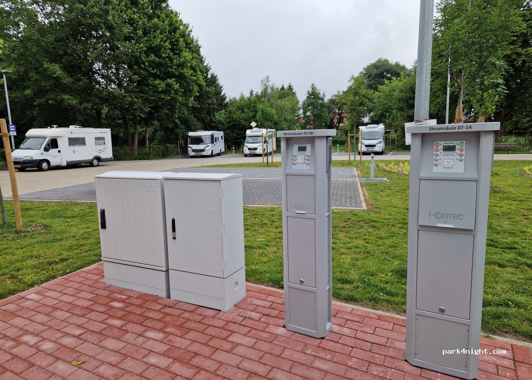Lage schön und ruhig, am WE sehr belebte Umgebung Schlagbäume an Ein-u.Ausfahrt, mit Kamera zur Kennzeichen-Erkennung, was man vor Einfahrt am Bezahlautomat eingeben muss. Max. 3 Nächte,über 8m Länge ungeeignet 1,4 km bis ins Zentrum des Ortes Strom 0,75€/kWh kostenloser Ausweichplatz (ohne Strom oder Frischwasser, mit Entsorgung) am "Friedrich-Berentzen-Weg" für alle Fahrzeuggrößen geeignet