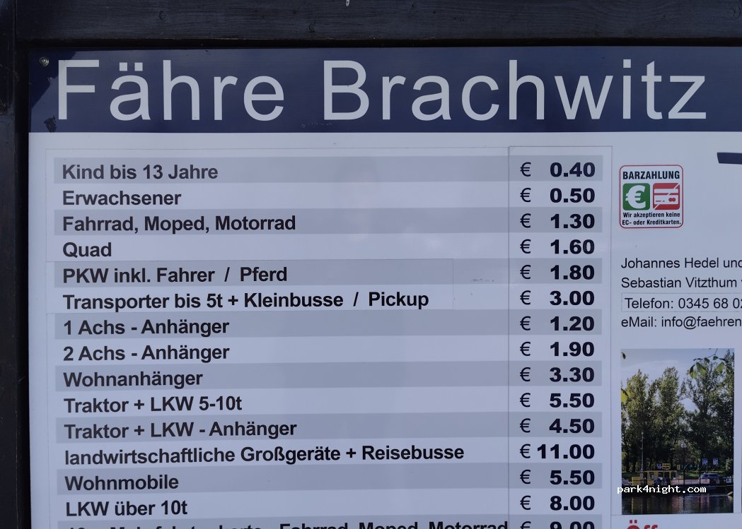Ein sehr schöner, ruhiger Platz direkt an der Saale, unweit der Fähre von Brachwitz. Es gibt einen Feuerplatz mit Grills. Den Stellplatz zahlt man auf der Fähre, wo ein sehr netter Mann die Quittung ausstellte. Einziger Minuspunkt: die Klos sind nicht offen, sondern nur gegen einen Schlüsselpfand von 10 Euro und 2 Euro Gebühren zu benutzen. Ansonsten klare Empfehlung.