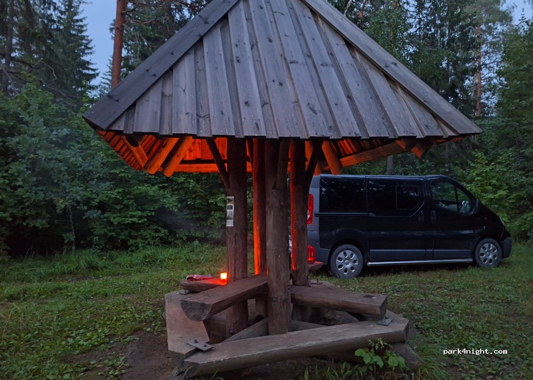 pěkné místo v lese, suché toalety, pumpa na vodu, přístřešky se stoly a lavicemi, místo na oheň. Spali jsme jednu noc cestou do Finska, stejně jako loni. V noci klid, s námi jeden camper také na jednu noc.
