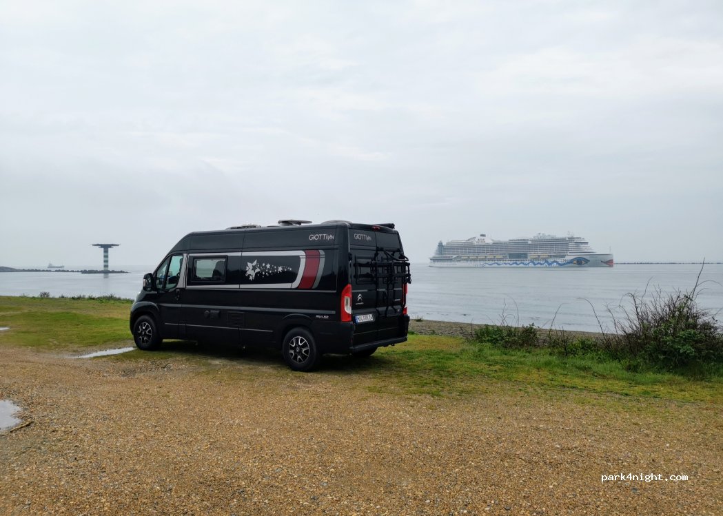 Großer Parkplatz. Untergrund Kies/Sand. Einige Schlaglöcher. Windräder sind heute kaum zu hören. Dafür sitzen wir bei einem Kaffee und bestaunen die vorbeifahrenden Schiffe. Toller Platz für alle, die gerne größere Schiffe in Aktion sehen.