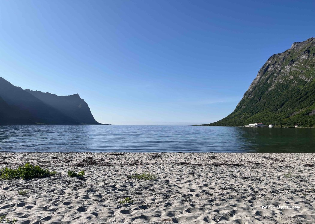 Bon parking, relativement plat. Belle vue sur le fjord, situé juste en bord de plage. La route a proximité n’est pas très gênante. Toilettes sèches sur place.