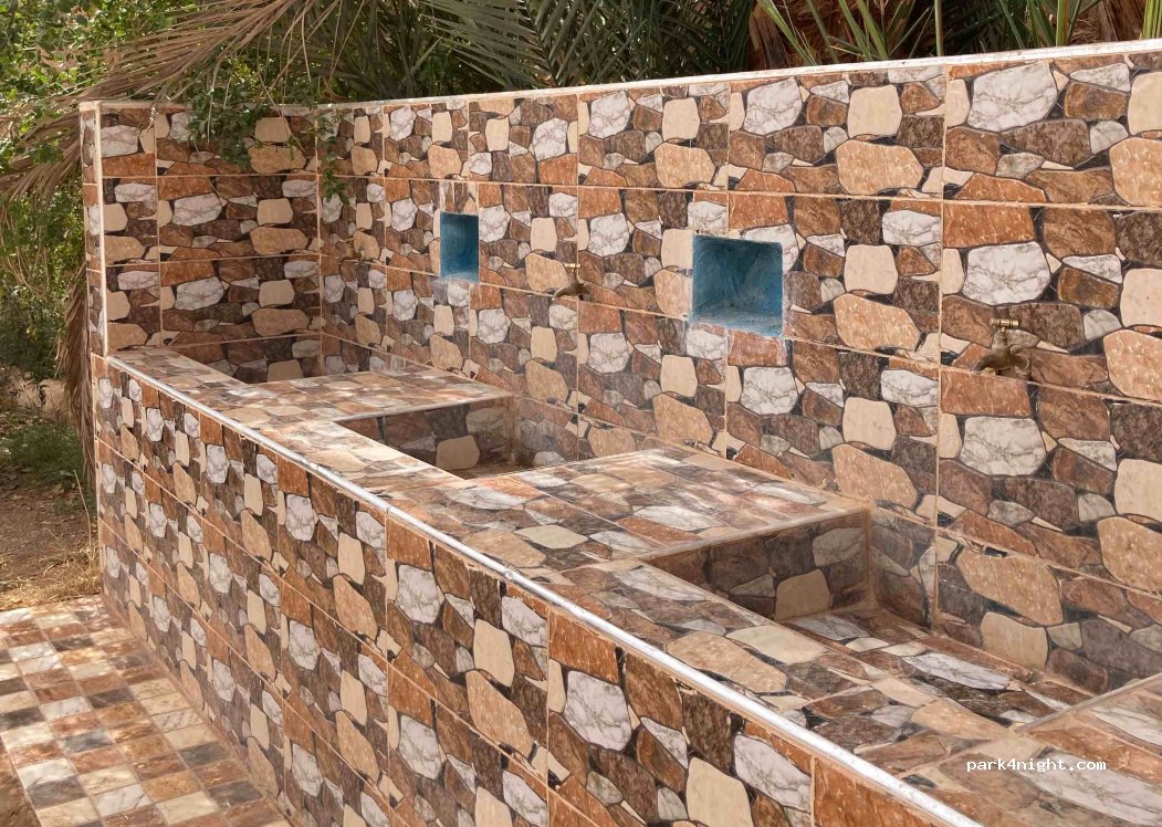 camping dans un riad hôtel avec piscine,des sanitaires très propres, des douches bien chaudes. Actuellement beaucoup de monde car le nord du pays a une très mauvaise météo. Ne rater pas de déguster une bonne pastilla au restaurant vous ne serez pas déçu.Nous reviendrons si nous passons par Zagora