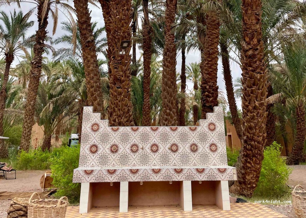 This campsite is in the middle of palm trees. You can park with full shade or only some shade if you want to charge using solar. There is a back gate that brings you out to a warren of alleyways where people live. The owner get you to park and puts a mat and small table at your door. He then greets you with sweet mint tea while you fill out the form and has good English complements of his American English teacher when he went to school. He also has a little shop with locally made clothes. I bought a Berber head scarf (80 dirham) and my wife bough a loose trousers (150 dirham). No haggling and the price is the price. You can also fit on the clothes. We got both for 200 dirham. The sanitary block is kept very clean. The men's showers are hot but only one has a place to hang the shower head up. The women's you can hang both shower heads. The WiFi has a code and works well at reception. The electricity has no earth and measured 238v. You can also order food to your van. A fresh flat bread is delivered to your van or rather left on the table outside in the mornings. There is a washing machine and dryer beside the sanitary block. Just leave you clothes beside it and they will be washed and dried for you for 25 dirham. The town is 10mins walk away with small shops, cafes and restaurants. Seemingly this is a great town to get you 4x4 serviced at one of the local garages... This is a 5 star campsite.