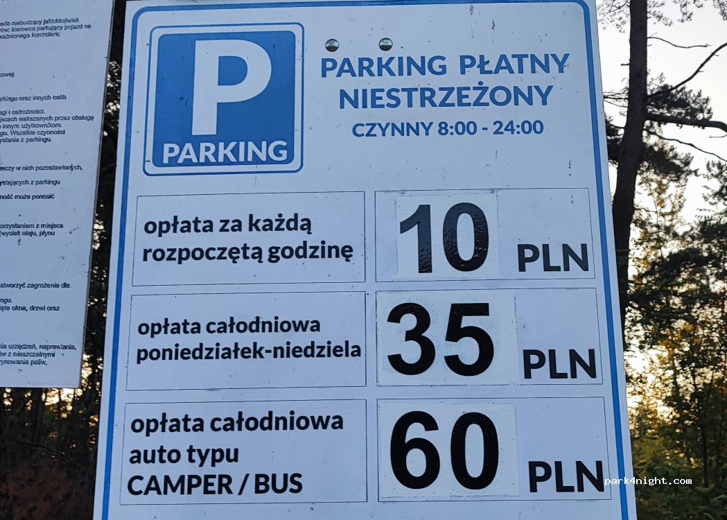 free from 24-8am. After 17 or something when guy selling tickets leaves you can pay only with coins to machine, but I think it's okay when you pay them in the morning.. We did not know night was free as all is in polish and bought 50pln full camper ticket that was only valid for next morning, but instead of ticket they gave us notice that we can stay full end of next day and smile on the note..