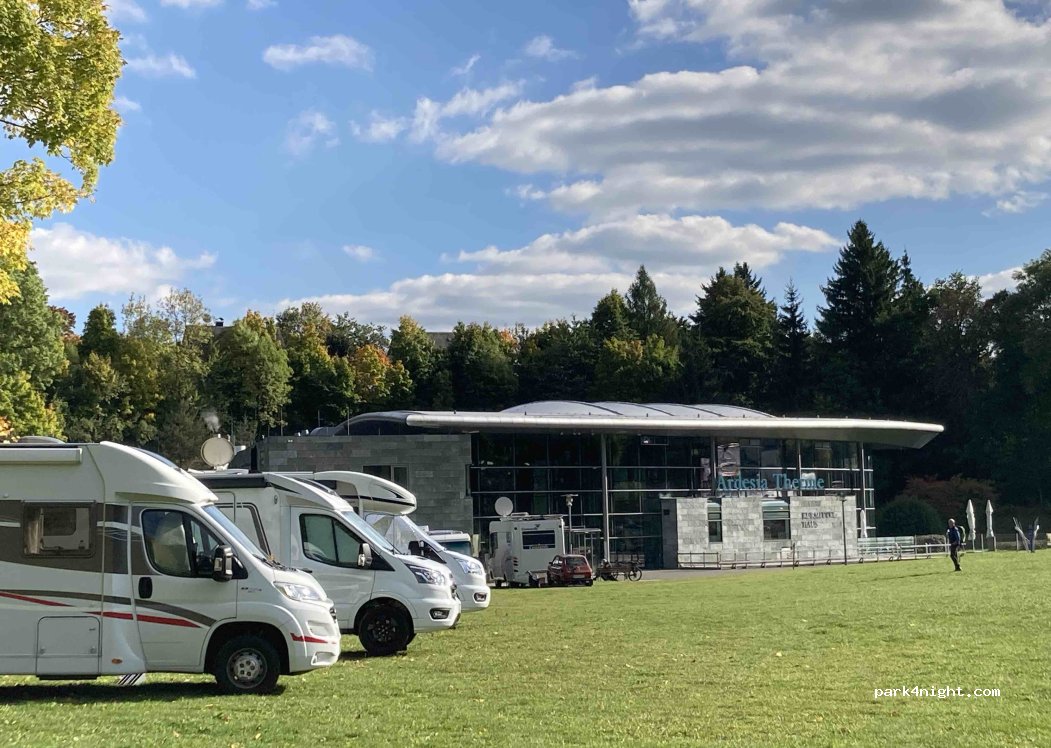 Hier gibt es die Möglichkeit, nach der Entspannung in der Therme gleich stehenzubleiben. Weil wir keinen externen Strom brauchen, sind wir nicht in den Parklücken geblieben, sondern haben uns - nachdem wir gefragt hatten - auf die Wiese gestellt. Ver- und Entsorgung geht nur umständlich zu festen Zeiten mit Thermenpersonal. Die Ruhe war früh morgens durch 2 Züge und Straßenverkehr vorbei.