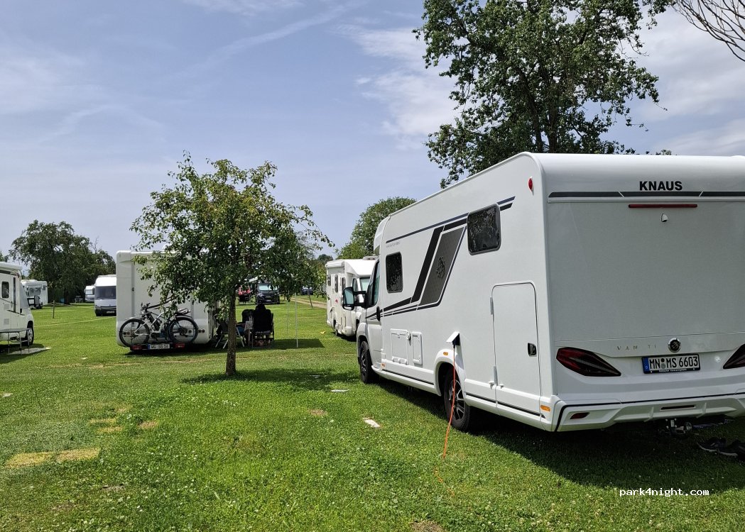 Super Stellplatz für 24 Euro all inklusive. Radwege in alle Richtungen. Am Bodensee zum Baden in 10 Minuten zu Fuß. Biergarten am Platz. Ein und Ausfahrt über Parkschranke Kontaktlinsen. Kein Test notwendig.