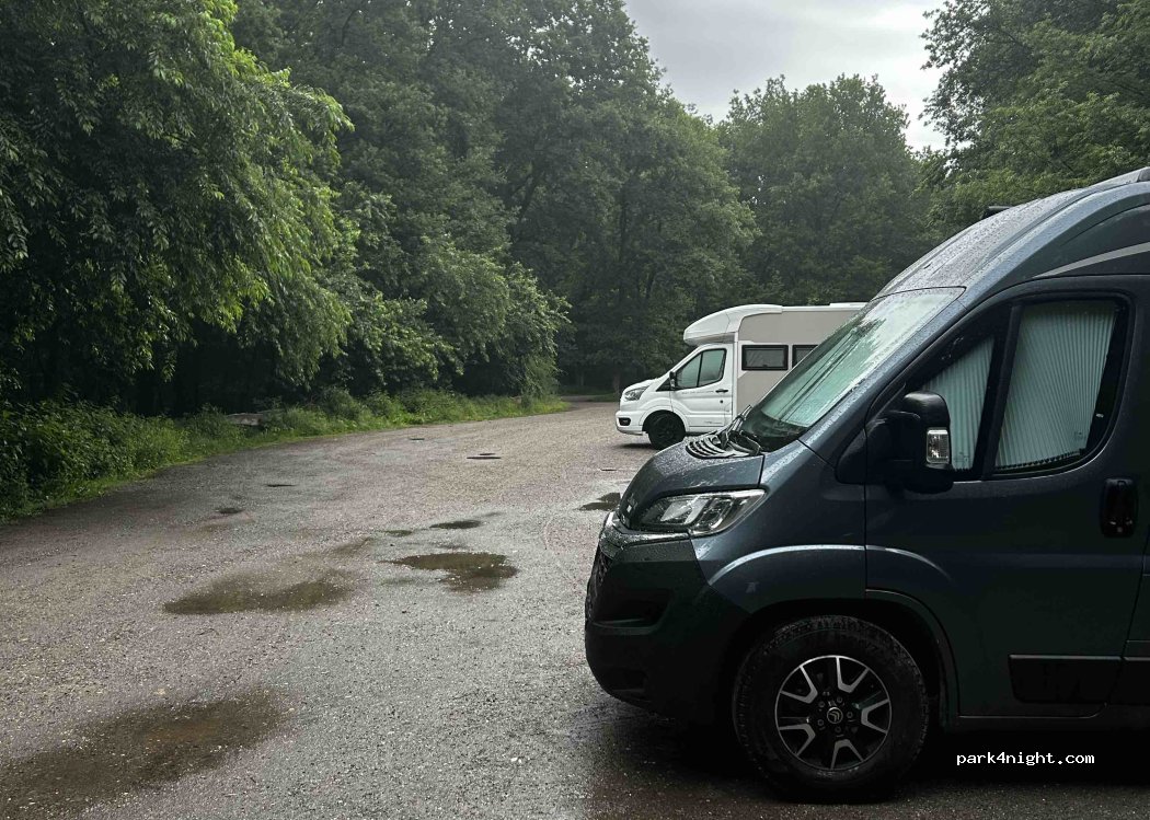 Great night stopover, very quiet and just off the motorway. Lovely forest walks, ideal for dogs. Only one other campervan, a few parked up for walking… but all went very quiet after 8.30pm.