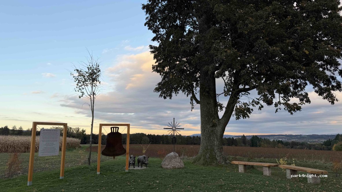 Parking lot below the church. Mainly flat, fortified free mobile home parking space. The centre is within walking distance. The oldest still ringable octave bell in the world.