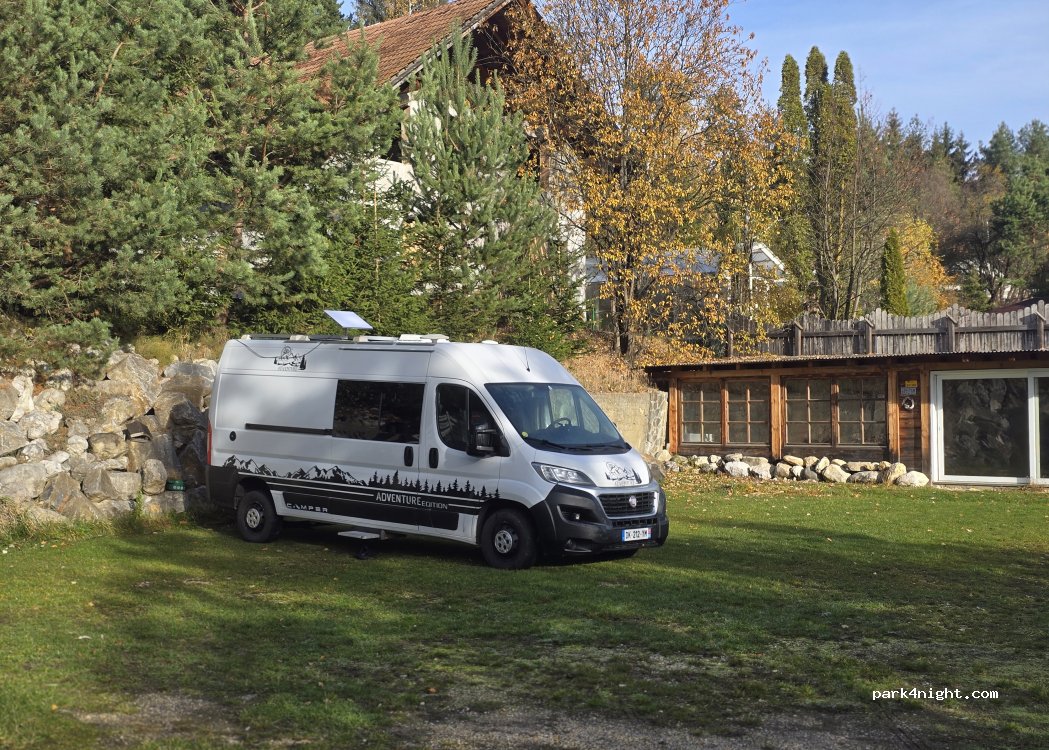 Struttura super! È un B&B in stile alpino con all'esterno un curatissimo prato, pianeggiante, sul quale possono sostare circa 10 camper. La zona è tranquilla e la notte silenziosa. Bagni e docce sono quelli del B&B. I prezzi onesti. Sono stato qui con un gruppo di 5 camper e Costantin ci ha fatto il transfer per il santuario degli orsi. Esperienza davvero eccezionale.