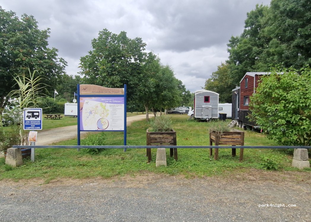 Aire sympa près du village avec resto, bar, vival, boulangerie, rôtisserie avec bcp de choix à emporter, pensez à eux en remerciement de ce bel endroit gratuit... ballade en velo au lac de cebron. tri sélectif donc ne cherchez pas les ordures ménagères et faites comme nous, repartez avec et déposez les dans une poubelle adéquate par respect pour la commune qui vous accueille si bien.