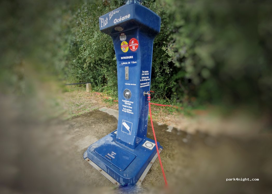 Endroit tres sympathique grand espace proche du village atypique attention quand il pleut mais nous avons pris un gros orage en pleine nuit (aout) et on est sorti tranquille service 1 euros pour 20 min deau mettre 3 pièces et appuyer sur le bouton pr récupérer les 2 en trop route un peu passante la nuit