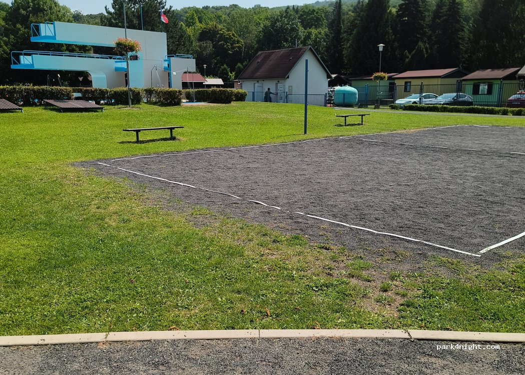 Place de parking payante dans le camp de voitures au milieu d'un complexe de bungalows et suivie par une piscine extérieure. Allongé entre la gare et la rue. Restaurant très proche.