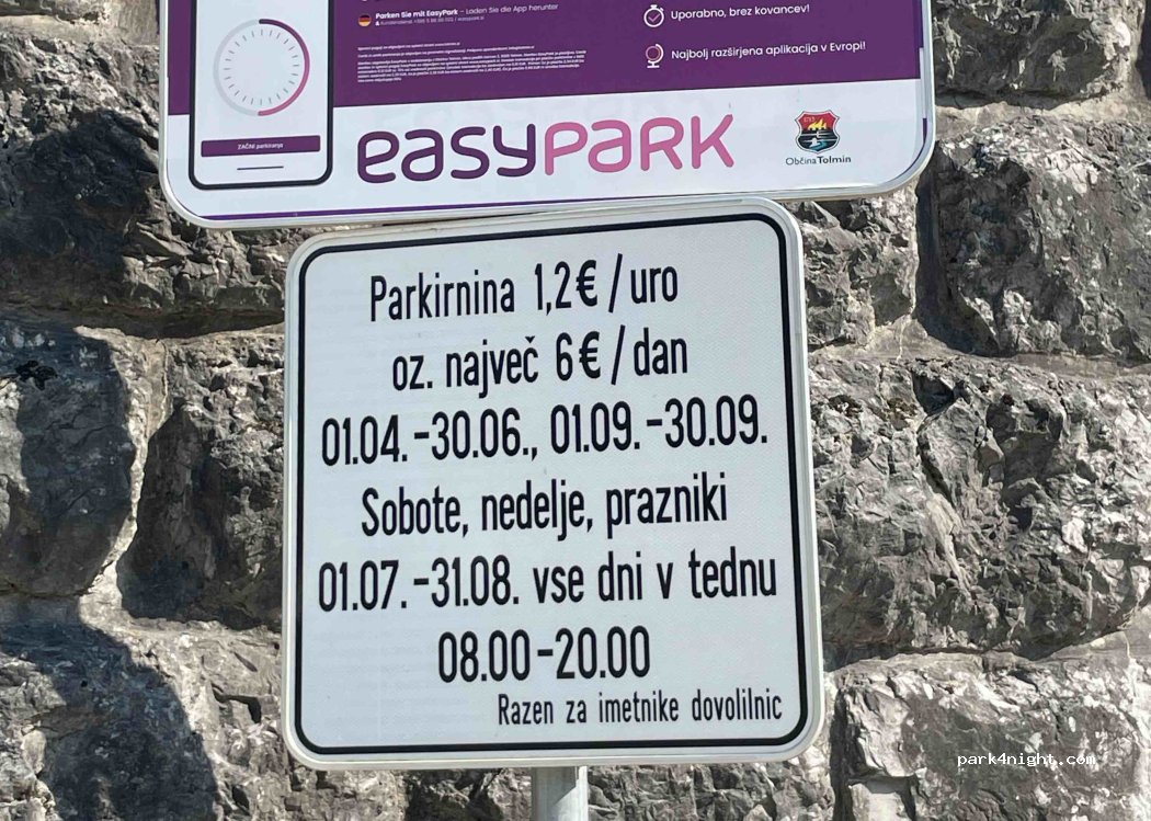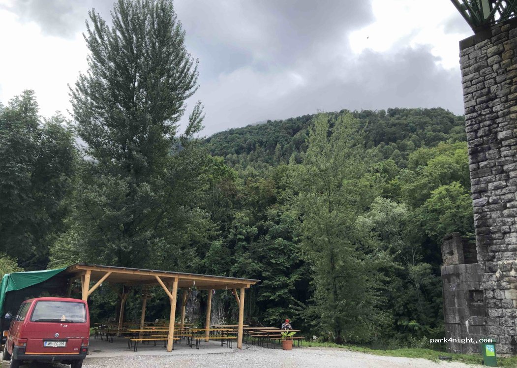 This location is at Baca and not free parking, not allowed for overnight with campervans, this summer again, people got problems with the police. it's written the rules and parking app, but only in Slovene. Use google translate with camera function.