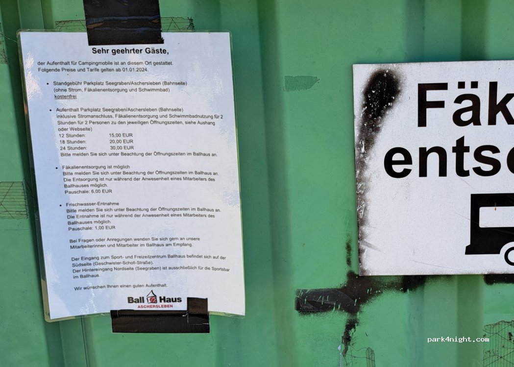 Übernachtung ohne Strom und ohne Entsorgung kostenfrei !! WC-Entsorgung 6€. Wasser 1€. Strom, WC-Entsorgung und 2h Schwimmbad für 2Personen =20€(12h),30€(18h),40€(24h). Lidl und Edeka in unmittelbarer Nähe.