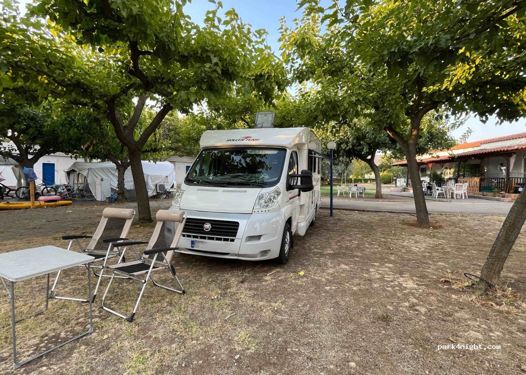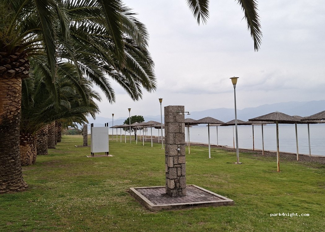 Interstation campsite! Large campsite by the sea. Quite well maintained even in the off-season. Lots of well-trimmed trees and green grass. The beach is accessible from the campsite and the water is very beautiful and clean. There are parasols and showers on the beach. Also suitable for large motorhomes.