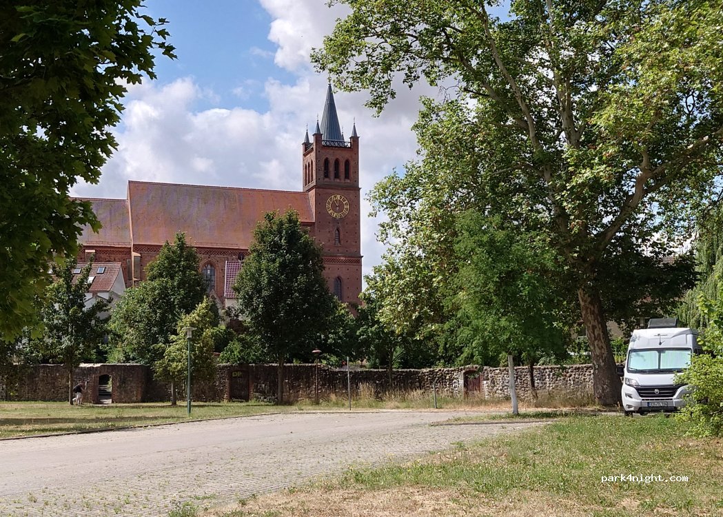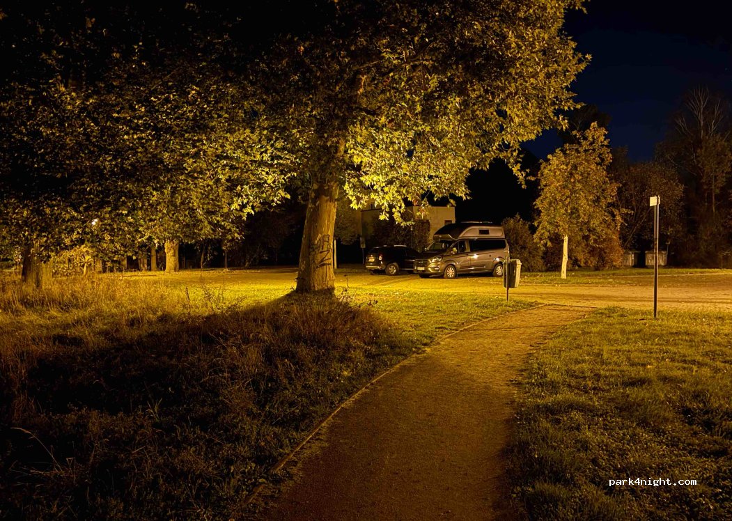 Fortified parking at the city wall. Quiet, with trees and green spaces.