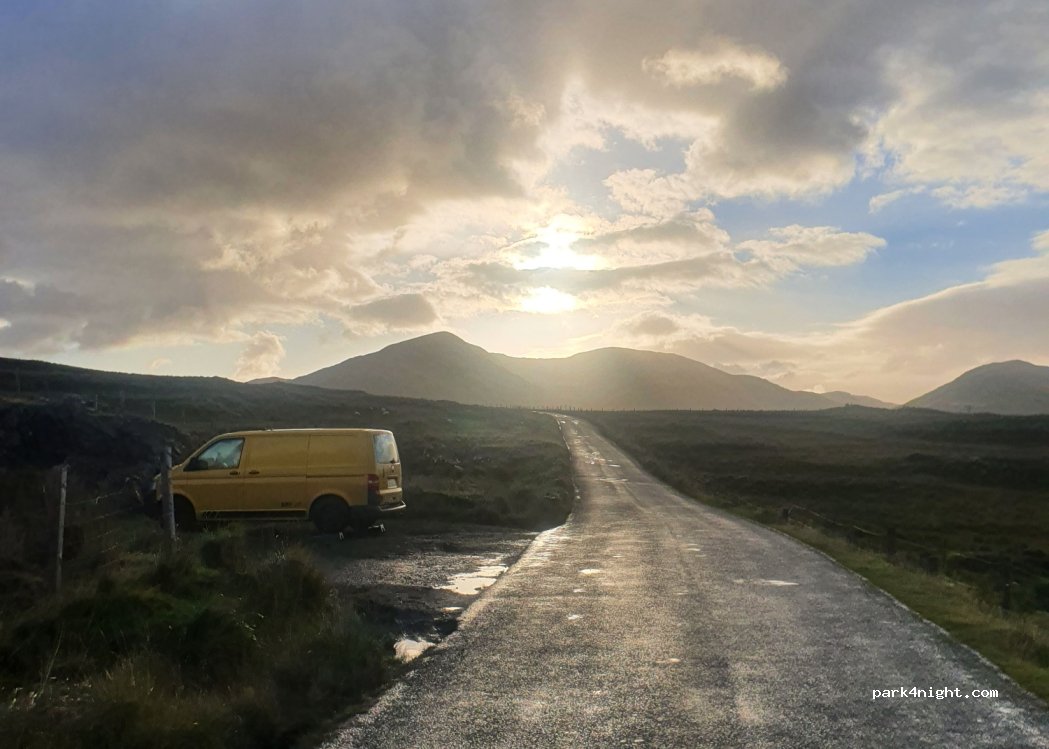 Nuit tranquille, pas de midgees, peut être parce qu'il y avait beaucoup de vent. La vue est superbe. L'emplacement est quasi plat. Nous avons tout de même utilisé les cales. La route est très passante jusqu'en fin de soirée et à partir de 6h le matin: (horaires d'embauche et débauche des habitants du coin) Les irlandais roulent très très vite sur cette route en ligne droite.