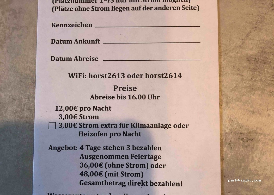 max ein Stern, der Platz bietet für 11 €/24 Std. nichts, kein Zahlautomat, Androhung von Strafe, wenn man kein Kleingeld im Briefumschlag in einen Briefkasten wirft. VE vorhanden, sehr rustikal u. unhygienisch,offenes Rohr, Deckel o. Griff Trinkwasserentn. bezgl. Hygiene, fraglich u. die größte Frechheit: für Durchreisende: VE 9,50 € ebenfalls unter Androhung von Kamera und Strafe 5,- €...