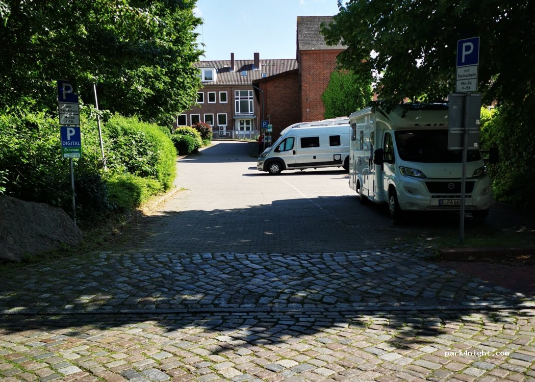 5 kurze Stellplätze auf einem Parkplatz (zu knapp mit 7 Meter-Mobil plus Fahrrad), auf dem längsten Platz kein SAT-Empfang. Strom defekt. Laut durch Straße mit Kopfsteinpflaster. Nette Innenstadt auf kurzem Weg erreichbar. Schöner See gegenüber des Parkplatzes. 6 Euro Höchstgebühr/Tag, max 7 Tage.