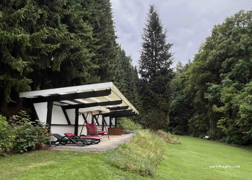 Parking à l'hôtel Hubertushöhe. Directement en bordure de forêt. Voie sans issue. Très calme. Toilettes accessibles 24h/24. Maxi-bar ouvert 24h/24 avec distributeur de boissons. Douche pour chiens, carte Sauerland incluse, livraison de petits pains. Les propriétaires de l'hôtel, eux-mêmes campeurs, offrent d'excellents conseils de randonnée et des correspondances de bus sont juste devant l'hôtel. Les campeurs sont traités comme des clients de l'hôtel. Les chiens sont les bienvenus. Un excellent point de départ pour le sentier Rothaarsteig.