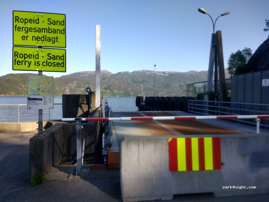 Parking for the pedestrian ferry to Sand/Stavanger: at least 3 boats a day, and several buses pass through regularly. A great place to spend the night, with accessible toilets and a heated lobby, but you have to leave room for locals to park and for buses to turn around ;)