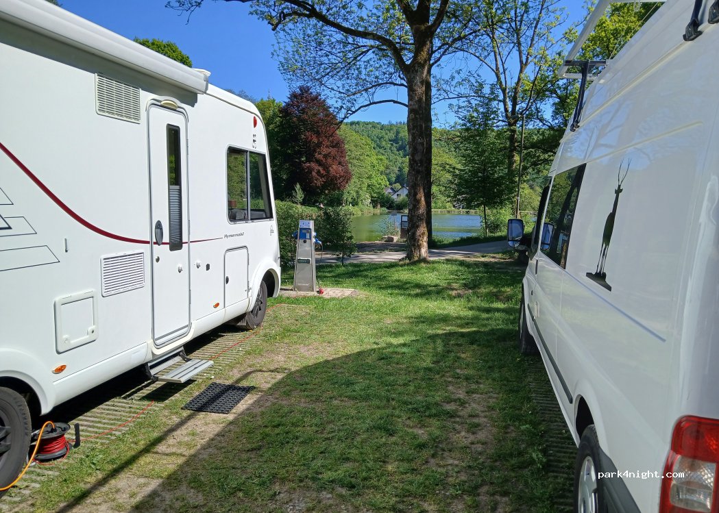 Schöner und kostenloser Stellplatz mit Strom und Entsorgungseinrichtungen. Ruhige Lage an einem kleinen See und nicht weit zum Aussichtspunkt auf die wunderschöne Altstadt von Freudenberg.