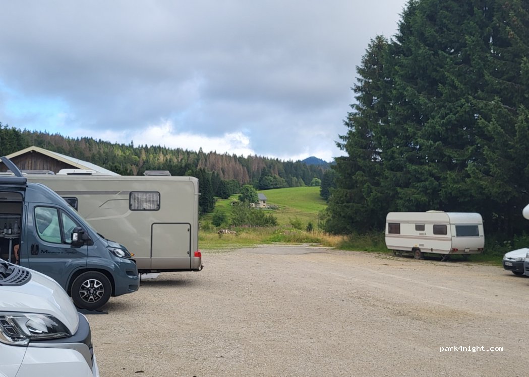Une belle vue à l’arrière du parking mais énormément d’aller et venues surtout le week-end du fait d’une déchèterie proche et des containers de tri. Le week-end aussi, beaucoup de randonneurs pour le crêt de Chalam mais c’est ok car en général les randonneurs sont assez sympas. Connaissance avec quelques villageois assez sympas aussi.