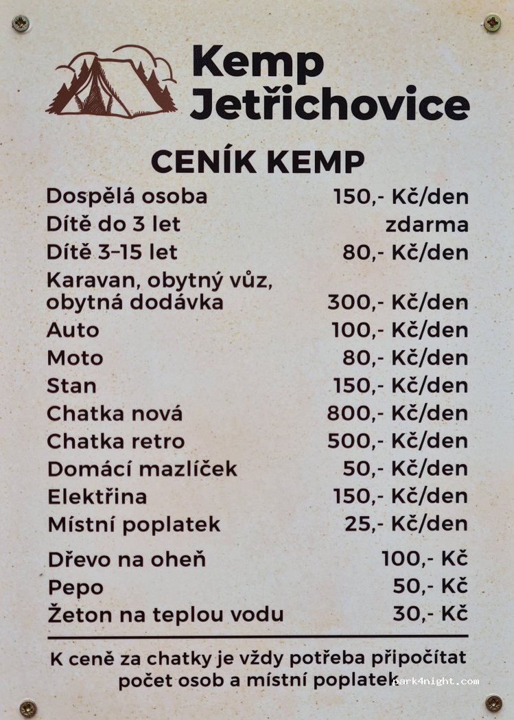 Camping Jetrichovice ! Joli petit camping avec piscine naturelle extérieure et kiosque. Situation calme, idéal pour les randonnées. Branchements électriques disponibles. Possibilité de faire des feux de camp. Filet de volley, table de ping-pong, château gonflable, aire de jeux et buts de football à disposition. Grands prés, bordés de rochers et d'un ruisseau, espace libre. En avril 2025, le camping a été rénové et a ouvert ses portes avec de nouveaux propriétaires.