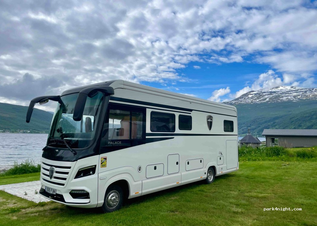 Great location with pitches right next to the fjord. Easy access for large Motorhomes. Grey water empty is a drive over grid. Location is stunning with mountains in the background and dolphins swimming by - perfect