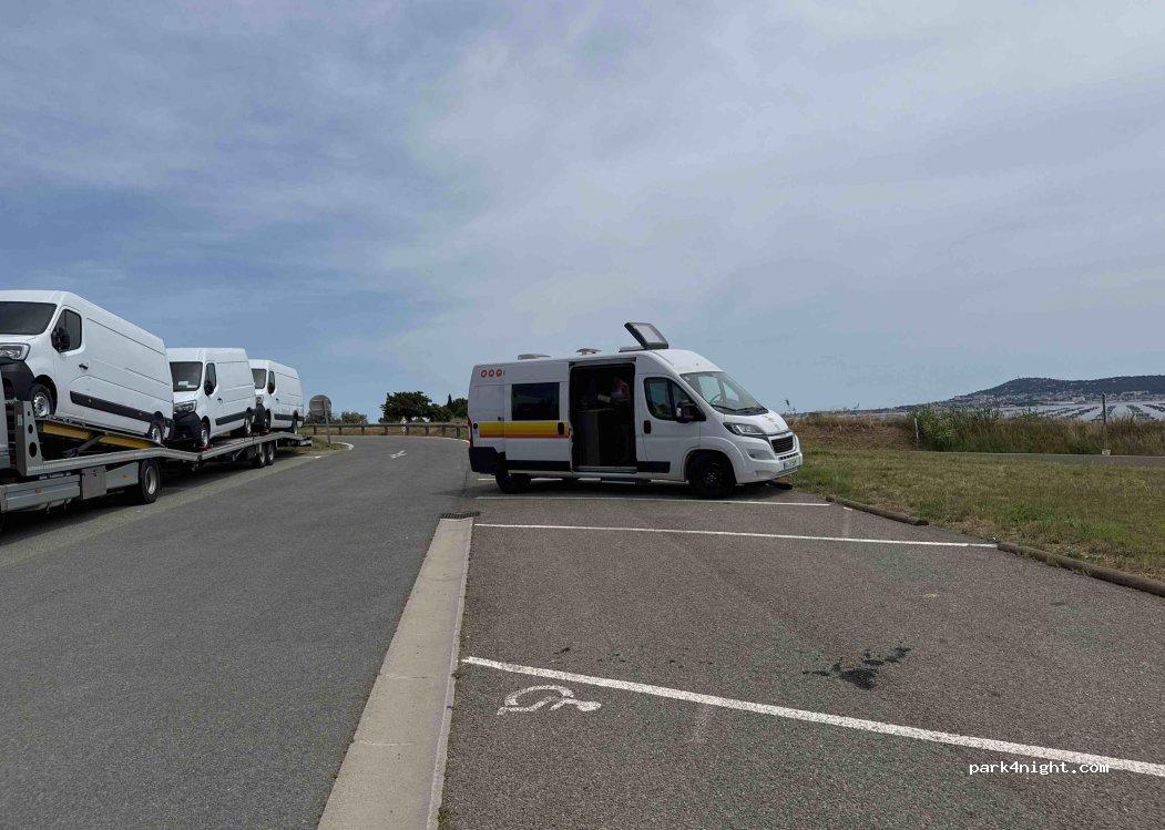 Aire de loupian nord. Au dessus de la route, vue sur sète et les parc à huîtres. Proche de celle de Bouzigue qui est surchargée. Idéal pour une nuit